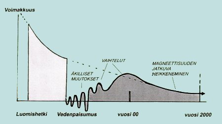 Vuodesta 1829 on mitattu maan magneettikentän voimakkuutta, jonka perusteella on piirretty oheinen käyrä. Siinä on otettu huomioon ne tekijät, jotka ovat voimakenttää järkyttäneet. Magneettisuuden voimistumisen (vuosia lisäämällä) aiheuttama kitka nostaisi maan pinnan lämpötilan elämälle epäedulliseksi. Magneettikentän muutokset puoltavat näkemystä nuoresta planeetasta. (The Young Earth/John D. Morris) | |