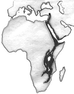 ![]() ![]() Itä-Afrikan hautavajoamaan liittyvä vyöhyke on merkitty karttaan tummalla. | |