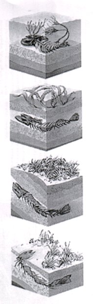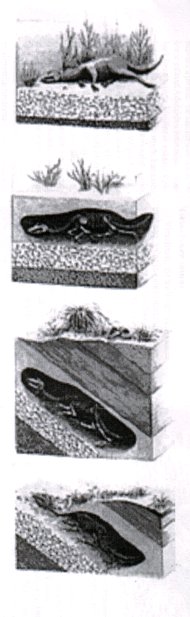 Kodin uusi eläinkirja, Gummerus, 1992, kertoo viereisen kuvasarjan avulla, kuinka eläimen menehtyessä se veteen joutuessaan vajoaa ja hautautuu muta- ja hiekka kerrostumiin. Kirjan mukaan kerrostumista tapahtuu, kunnes eläimen ruumis on syvällä maanpinnan alla. Paineen vaikutuksesta sitä ympäröivä hiekka tai muta sitten tiivistyy sedimenttikiveksi ja samalla eläimen jäännökset fossiloituvat2 . Ihmeellinen luonto, Gummerus 1999/ Kivet & Fossiilit -kirjan tarkoitus on saada lukijat ymmärtämään, miten kiviä ja fossiileja tutkimalla voidaan selvittää mitä kaikkea on tapahtunut maapallon tuhansia miljoonia vuosia kestäneen historian aikana. Fossiilien synnystä on kuvasarja, jossa kerrotaan mitä pohjaan vajonneelle eläimelle tapahtuu: "...paljon aikaa kuluu ja eläimen luut hautautuvat sedimenttikerrostumien alle. Pohjaveden mineraalit syrjäyttävät vähitellen alkuperäiset luut."3 Biologian oppikirjassa Perinnöllisyys ja evoluutio, 1997 , fossiilien synnystä opetetaan: "Eniten fossiileja muodostuu vesien pohjalle vajonneista eliöistä, jotka peittyvät pohjakerrostumiin eli sedimentteihin, esimerkiksi jokien suistoissa."4 Kuva kirjasta: Kodin uusi eläinkirja