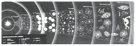 Fysiikan oppikirjassa Vuorovaikutus/WSOY-1996 kerrotaan, että yllä oleva kuva maailmankaikkeuden synnystä, joka alkaa alkuräjähdyksestä ja päättyy ihmiseen, perustuu tieteelliseen totuuteen. Oppikirjan kertomus kaiken alusta ja kehittymisestä ylittää mielikuvitusrikkaudessaan monet sadut. Kuinka moni opettaja uskaltaa kertoa oppilailleen, että kehyskertomus perustuu vain mielikuvitukseen ja vahvaan uskoon, että jotenkin kaikki kuitenkin kehittyi. | |