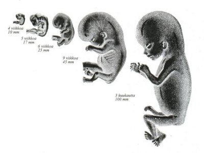 sikiön koko ja kehitys 1 kk:n ikäisestä kolme kuukautta vanhaksi. Näin saamme totuudenmukaisen kuvan sikiön muodosta ja kasvusta, päinvastoin kuin kehitysoppia tukevat kuvat koulukirjoissa, jotka kopioivat Ernst Haeckelin (1834-1919) kuvasarjaa.