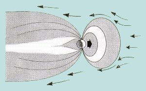 Maan magneettikenttä ulottuisi noin 80000 km ulos avaruuteen ellei auringosta suurella nopeudella lähtevät hiukkaset törmäisi maan magneettikentää vasten. Tämä aurinkotuuli painaa kentän auringon puoleiselta osalta kasaan magneettikilveksi ja takana magneettinen pyrstö venyy lähes 10 kertaa pitemmäksi. Magneettikentän heikkeneminen vähentää suojausta. Jos magneettisuus häviää, pääsevät sekä aurinkotuulen että kosmisen säteilyn haitalliset hiukkaset esteettä ilmakehään. | |