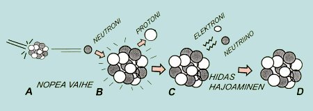 A) Lähes valon nopeudella liikkuva kosminen hiukkanen törmää ilmakehässä kaasuatomiin, josta irtoaa neutroni. B) Tämä nopea neutroni törmää typpiatomiin (N14), josta samalla vapautuu protoni ja näin typpiatomista tulee radioaktiivinen hiili-14 -atomi (C14). C) Hiili-14 -atomissa on nyt liian monta neutronia sisältävä ydin ja aikanaan (puoliutumisaika n. 5730 vuotta) yksi neutroni muuttuu protoniksi ja atomista irtoaa 1 neutriino (+-) ja elektroni (-). D) Hiili-14 muuttunut uudelleen vakaaksi , 7 protonia ja 7 neutronia sisältäväksi typpi-14 - atomiksi. Tapahtumaväliä C-D kutsutaan betahajoamiseksi.